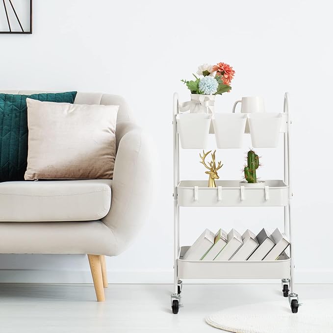 - Smart Storage Design: The 3-tier metal basket is perfect for organizing art supplies, toiletries, office essentials or kitchen spices. The storage cart also comes with 3 hanging cups and 4 hooks to maximize space for small items like brushes, scissors, or kitchen tools