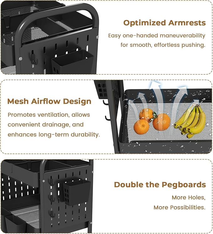 danpinera Craft Cart, Black Rolling Cart with Retractable Dividers & DIY Pegboards for Kitchen, Bedroom, Laundry
