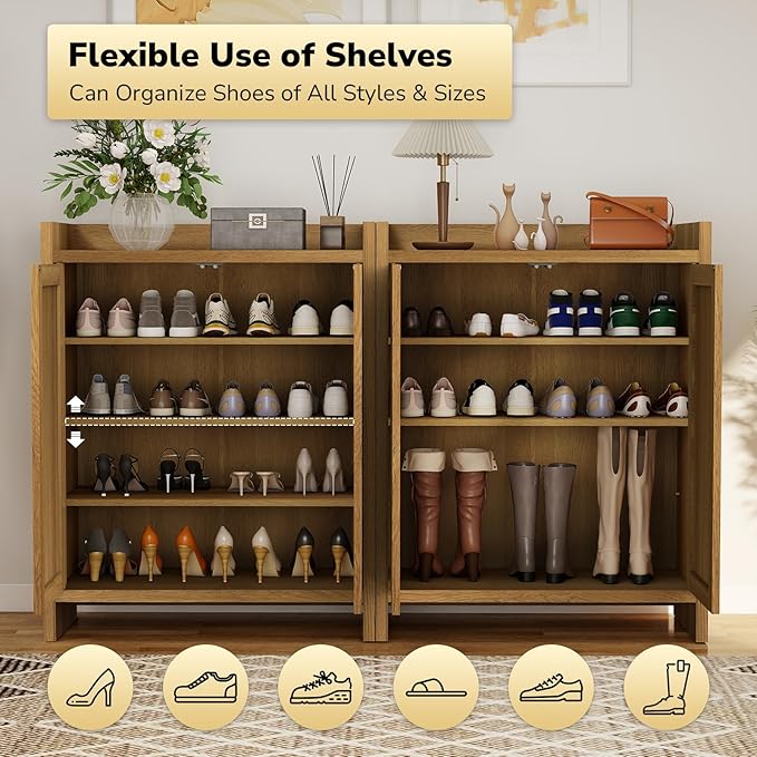 Boho 2 Doors Shoe Storage Cabinet for Entryway, Farmhouse Wooden Shoe Organizer for Front Door Entrance Hallway, Zapatero Organizador Rattan Shoes Cabinet (Oak, 2 Doors, 2 PCS)