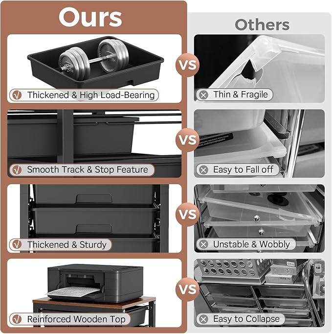 - WOODEN TABLETOP & THICK DRAWERS & METAL FRAME: Storage drawer cart with wooden tabletable top allows you to put plants,cricut maker, printer and other decorations.Drawers are made of thick and durable plastic material.Holds 33 pounds on tits op plate and 11 pounds per drawer.The utility cart with drawer boasts a sturdy and durable powder-coated steel frame with water and rust resistance ensures a sturdy construction and built to last.